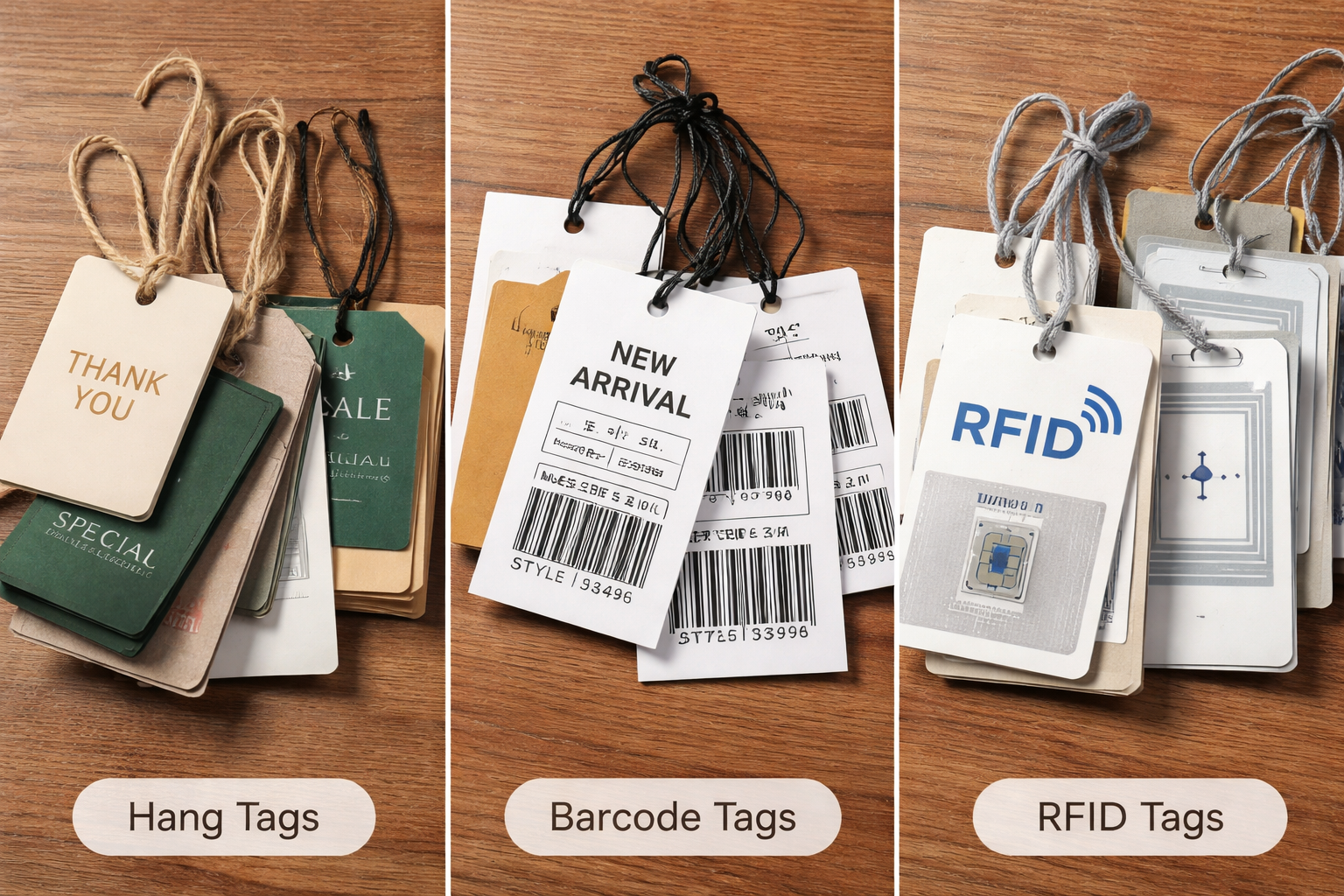 Hang Tags & Barcode Tags: Close-ups of texture—heavy-duty cardstock versus silky finishes. The barcode is no longer just data; it’s integrated into the design.